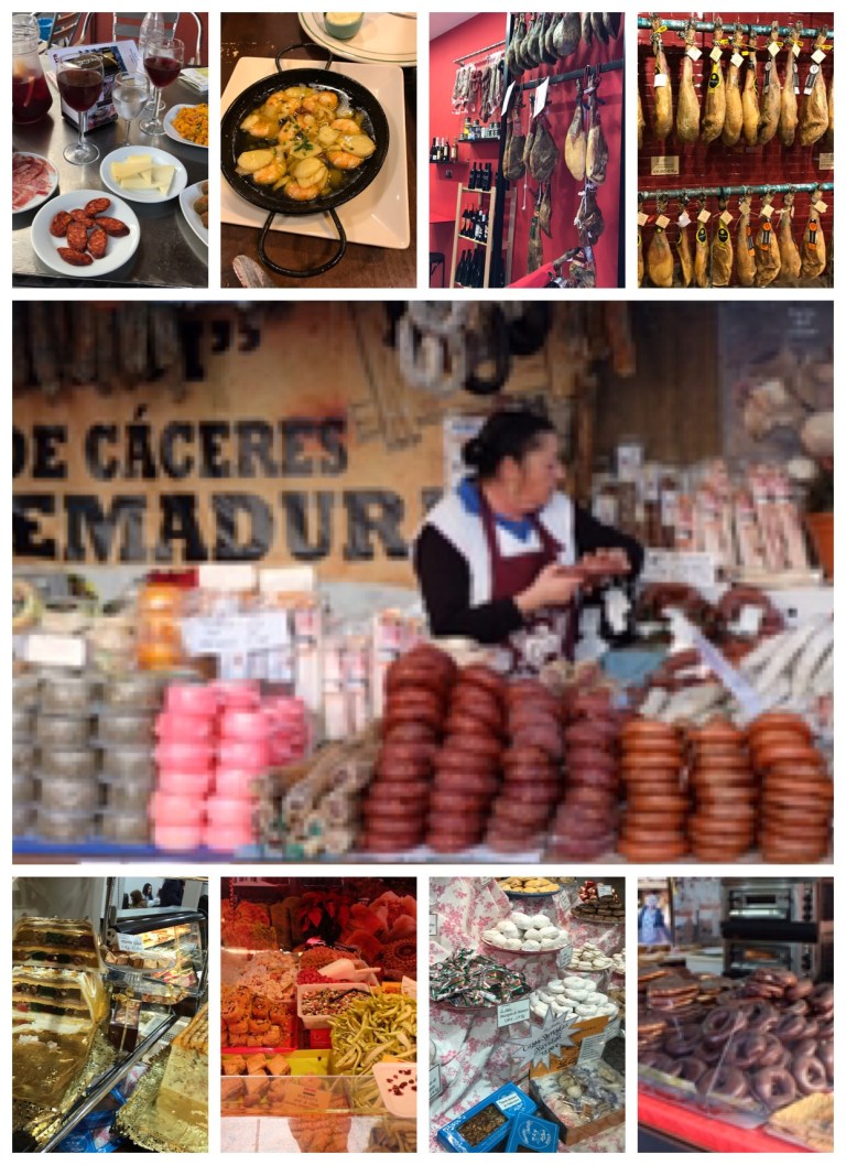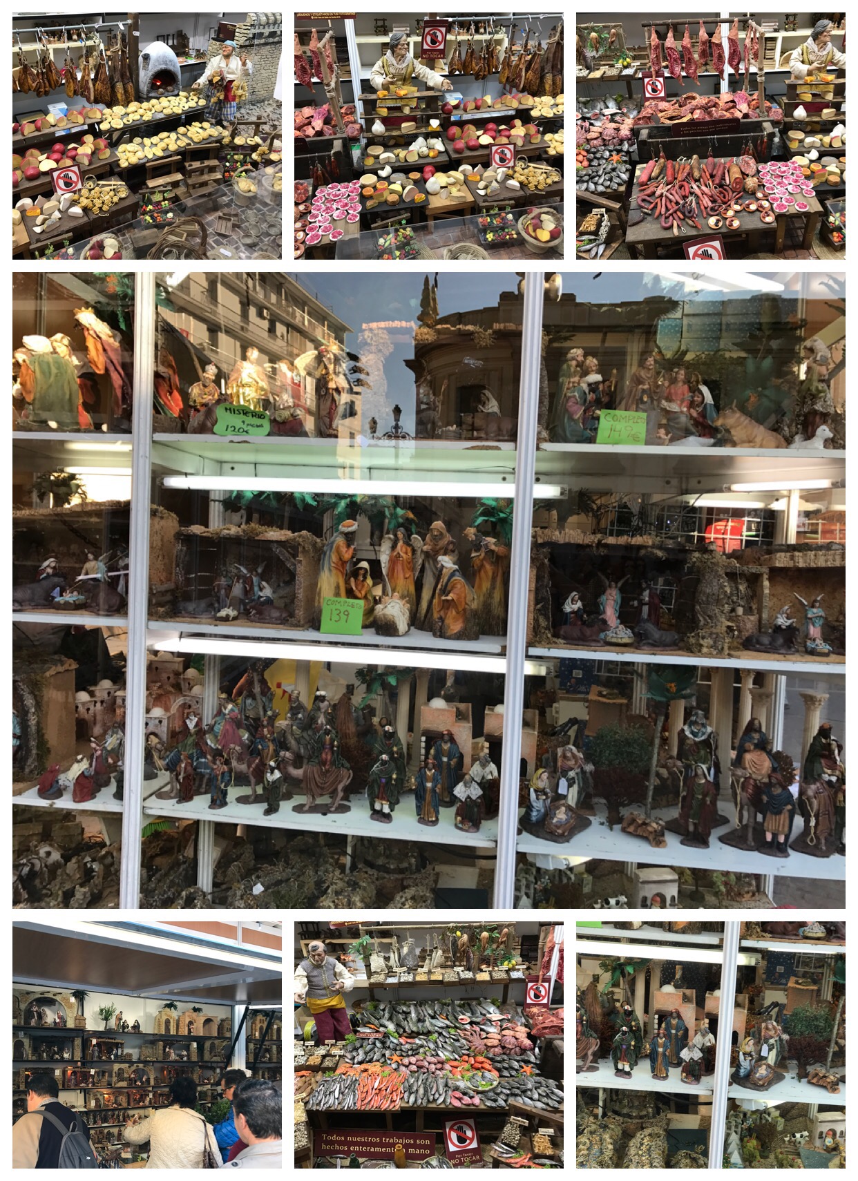 Doors and doorways. Could spend so much time making a study of these. Sturdy keep out the strangers most of them but beautifully made. And yes not all of these are in Seville.By the Cathedral there was a Christmas market-well about 15 large stalls. Sold everything you could possibly need for you Christmas home nativity scene. Not just your holy family, three kings, assorted angels and livestock. But you could get the inn, the waterfall (who knew there was one) the fields and crops, palm groves, neighbouring shops. The latter were fascinating with the most amazing detail. You could get from tiny objects to almost life size baby Jesus.Saw this when on our way to the Mushroom. Was tempted but need another week before I get the tresses attended to. Think also easier to give complex instructions in English.Food. As someone who loves ham, cheese, sausages and the such like Spain is like heaven. Olive oil. Bread. The sea food I had was great. Fruit -especially citrus. Tomatoes. And then you get into the sweet stuff. Cafe con Leche. Still hadn’t quite got into the swing of the eating hours but with effort and time I’m sure I could do it.