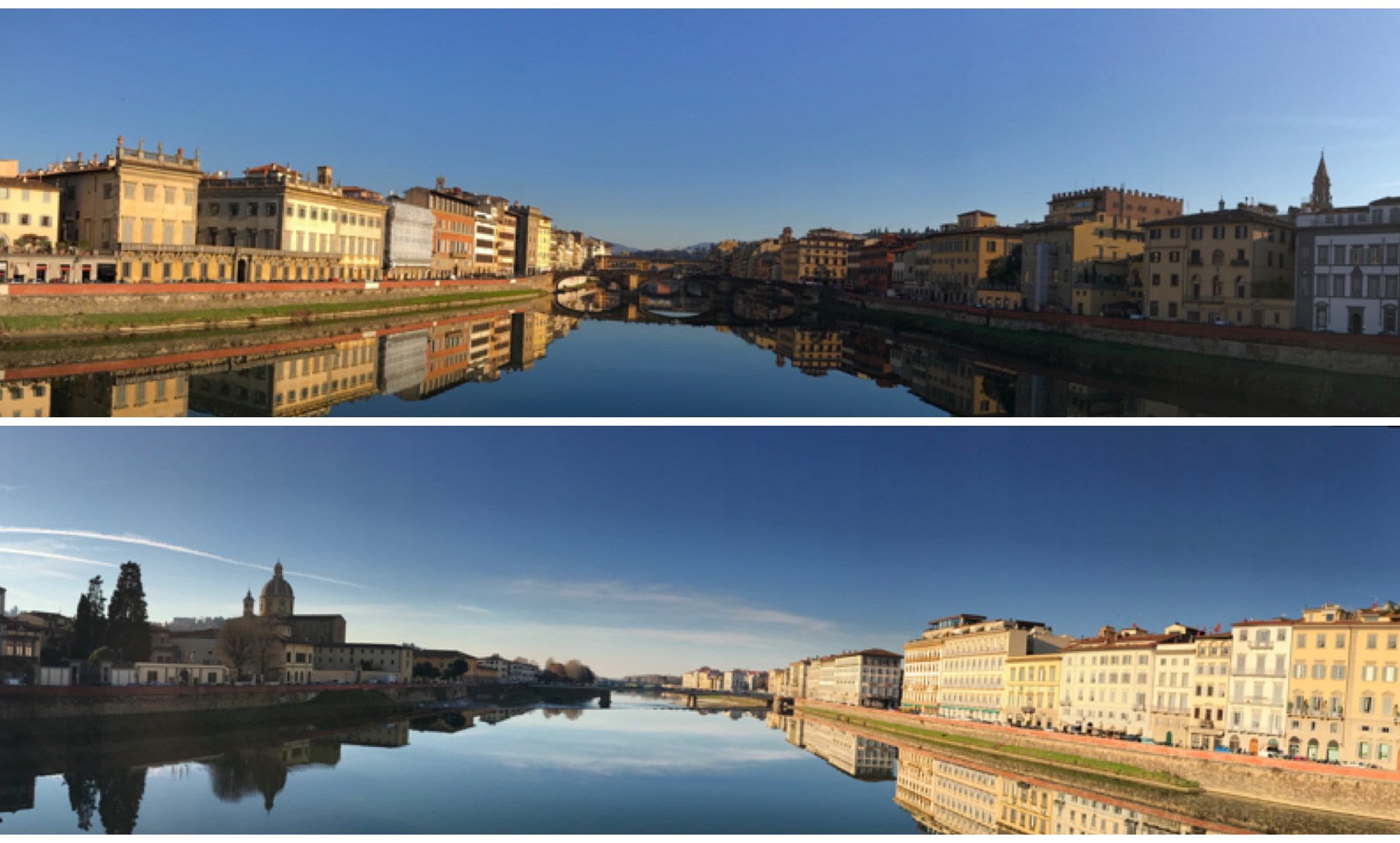 After the thick fog of yesterday it was great to wake to blue skies which just got bluer as the day progressed. It was a late start due to someone (me) sleeping late as a consequence of being “poorly” in the night. Had a simple breakfast in our beautiful breakfast room with great views.Decided on a gentle day of refamiliarising ourselves with the centre of the city. So an amble through to the Mercato Di San Lorenzo (Marcato Centrale). Planned on just having a good browse today. But the best laid plans etc. I now have a great leather jacket, so light and soft and not at all like the biker jacket one tried to sell me!The food market was amazing! A wander through some back streets brought us to Santa Maria Novella. Building began around 1360 and it took about 90 years to complete. Have visited before and will probably return. Then round the corner to the Officina Profumo Farmaceutica di Santa Maria Novella. It was founded by Dominican friars soon after their arrival in Florence in 1221. Beautiful interiors with smells to match. It’s on the Via della Scala, same as two hotels we’ve stayed in before. Found our way to Giorgio’s which is a great little restaurant where you get two courses and a carafe of vino for 13 euros. But we won’t be eating there this time as he’s closed until 3 January.Then onwards to find some lunch which was had in a cafe by the Arno. For me a light lunch of bruschetta, tomato and basil. Loving the old buildings and Alletways. On many corners there are beautiful religious paintings or statues. One I saw dates to sometime in the 15th century. But today’s star performer was the Arno. Not a ripple.